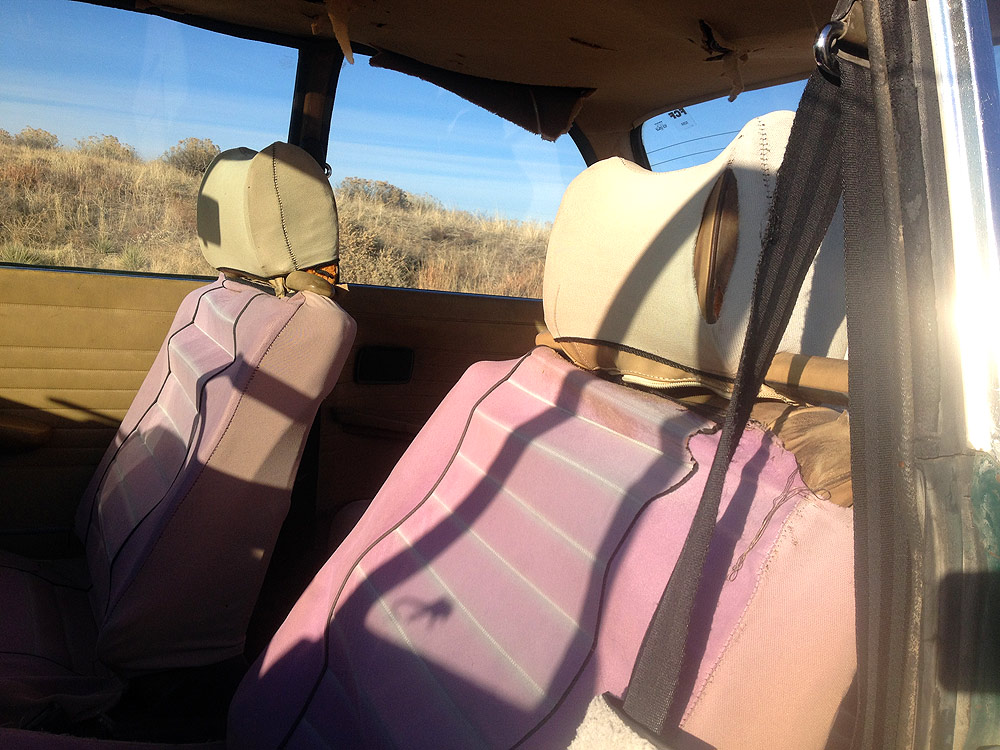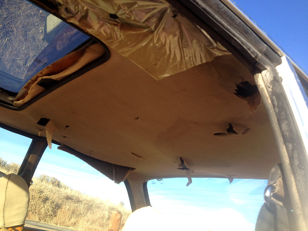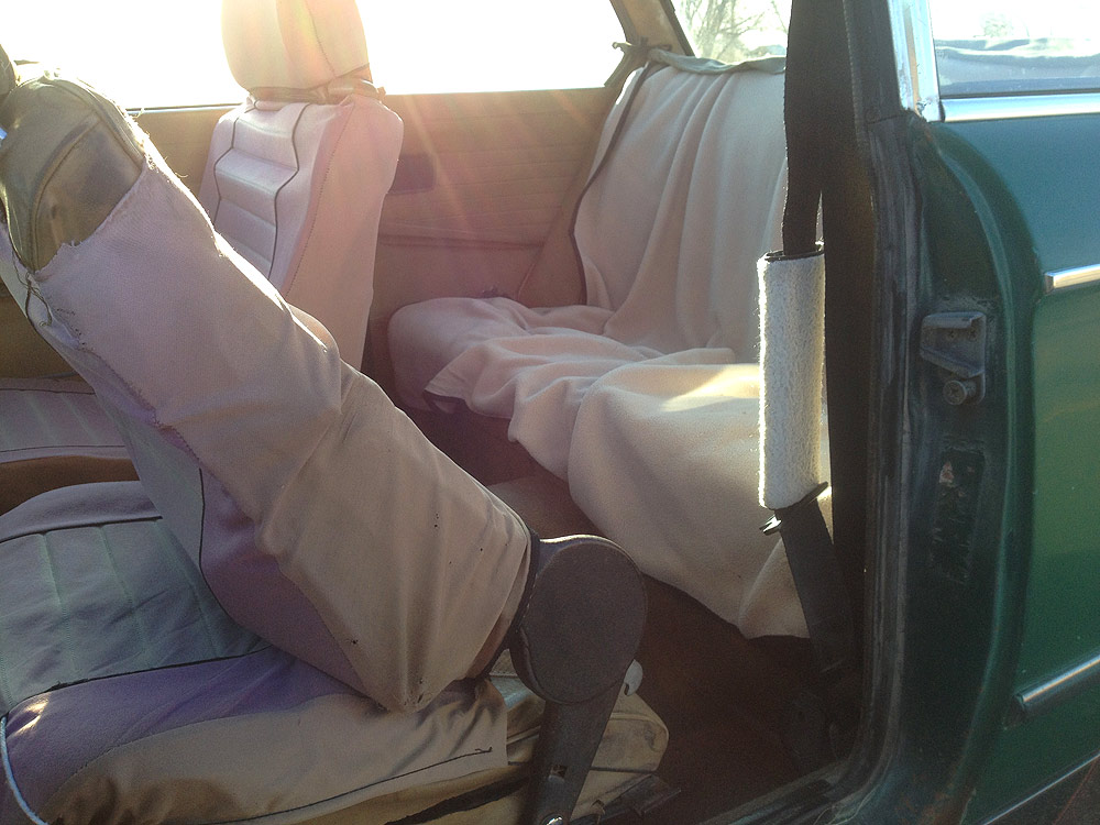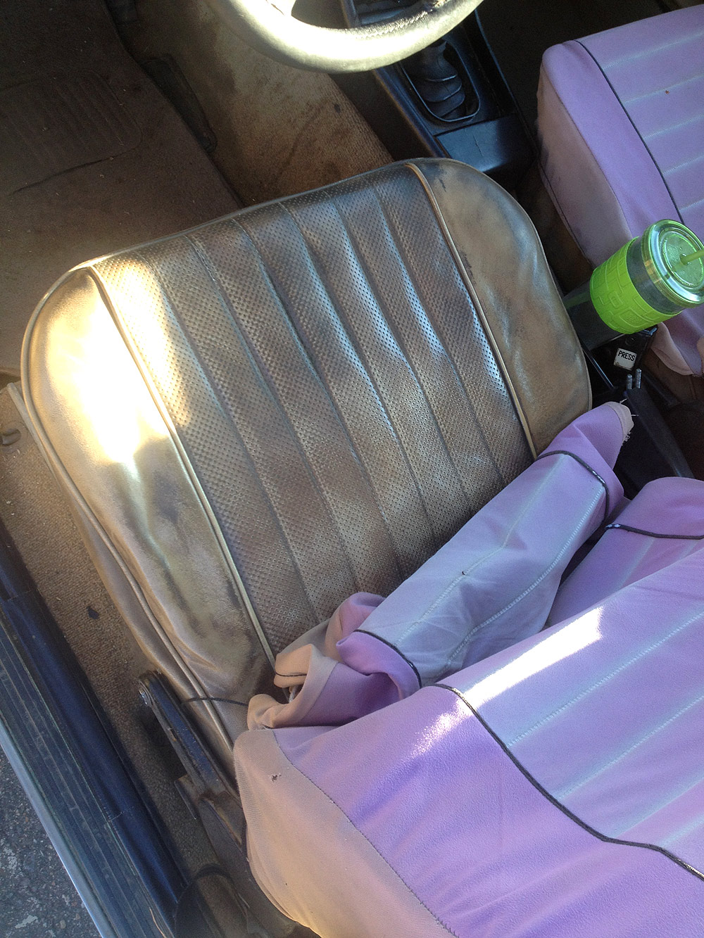 All of the interior wants attention. Headliner and rear seat cover are shredded. Front seats are in better shape but their leather is visibly aged and stained. Driver's seat is missing the knob used to adjust its angle of recline. Turn signal and wiper stalks were abused at some point, nonfunctional but still connected with the steering column. Speedometer needle is broken. Temp and fuel gauges are erratic.